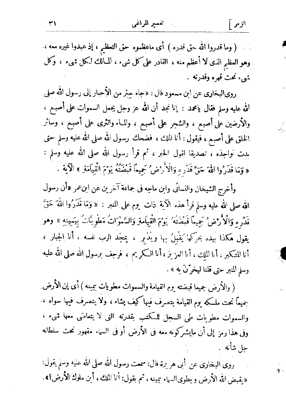 وأخرج الشيخان والنسائي وابن ماجه في جماعة آخرين عن ابن عمر «إن رسول الله صلى الله عليه وسلم قرأ هذه الآية ذات يوم على المنبر: «وَما قَدَرُوا اللَّهَ حَقَّ قَدْرِهِ وَالْأَرْضُ جَمِيعاً قَبْضَتُهُ يَوْمَ الْقِيامَةِ وَالسَّماواتُ مَطْوِيَّاتٌ بِيَمِينِهِ»