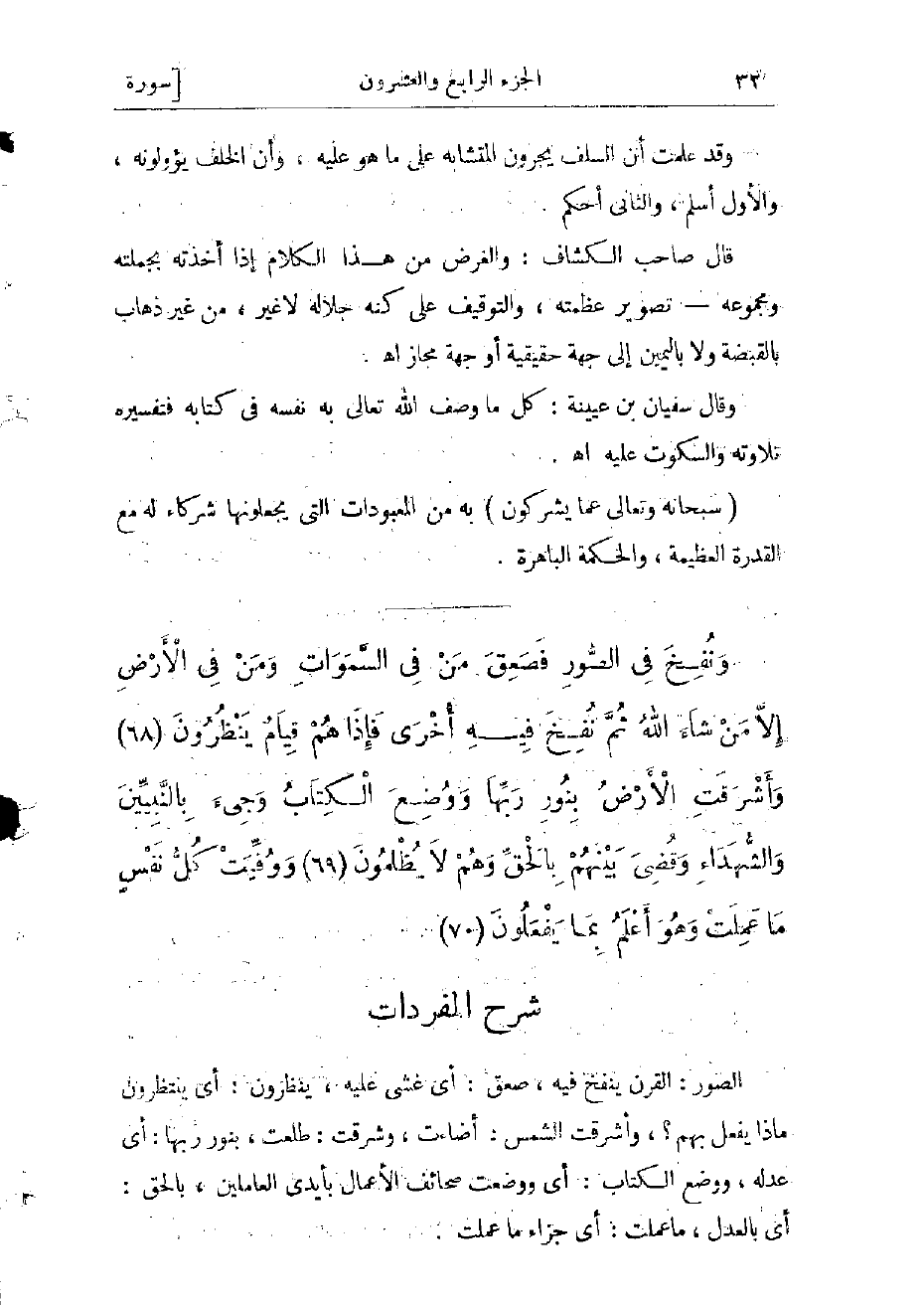 الصور: القرن ينفخ فيه، صعق: أي غشى عليه، ينظرون: أي ينتظرون ماذا يفعل بهم؟ وأشرقت الشمس: أضاءت، وشرقت: طلعت، بنور ربها: أي عدله، ووضع الكتاب: أي ووضعت صحائف الأعمال بأيدى العاملين، بالحق: أي بالعدل، ما عملت: أي جزاء ما عملت.