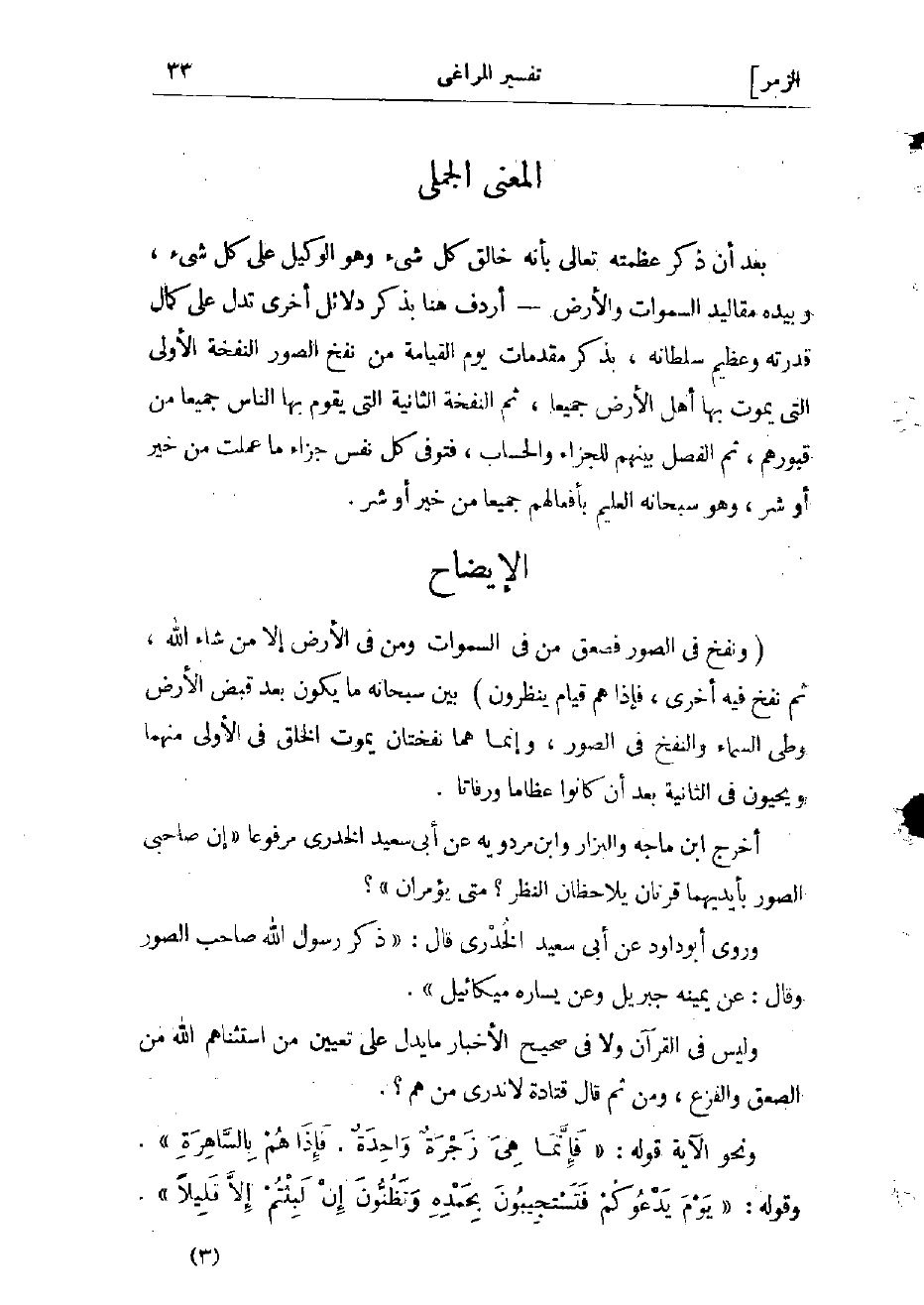 (وَنُفِخَ فِي الصُّورِ فَصَعِقَ مَنْ فِي السَّماواتِ وَمَنْ فِي الْأَرْضِ إِلَّا مَنْ شاءَ اللَّهُ، ثُمَّ نُفِخَ فِيهِ أُخْرى، فَإِذا هُمْ قِيامٌ يَنْظُرُونَ) بيّن سبحانه ما يكون بعد قبض الأرض وطىّ السماء والنفخ في الصور النفخة الأولى، إذ هما نفختان يموت الخلق في الأولى منهما ويحيون فى الثانية بعد أن كانوا عظاما ورفاتا.