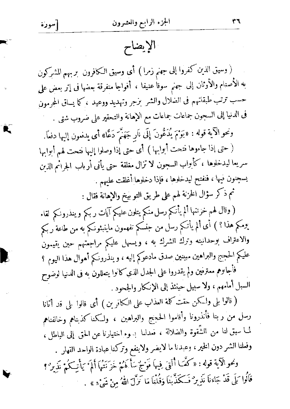 (وَسِيقَ الَّذِينَ كَفَرُوا إِلى جَهَنَّمَ زُمَراً) أي وسيق الكافرون بربهم، المشركون به الأصنام والأوثان، إلى جهنم سوقا عنيفا، أفواجا متفرقة بعضها في إثر بعض بحسب ترتب طبقاتهم في الضلال والشر- بزجر وتهديد ووعيد، كما يساق المجرمون في الدنيا إلى السجون جماعات مع الإهانة والتحقير على ضروب شتى.