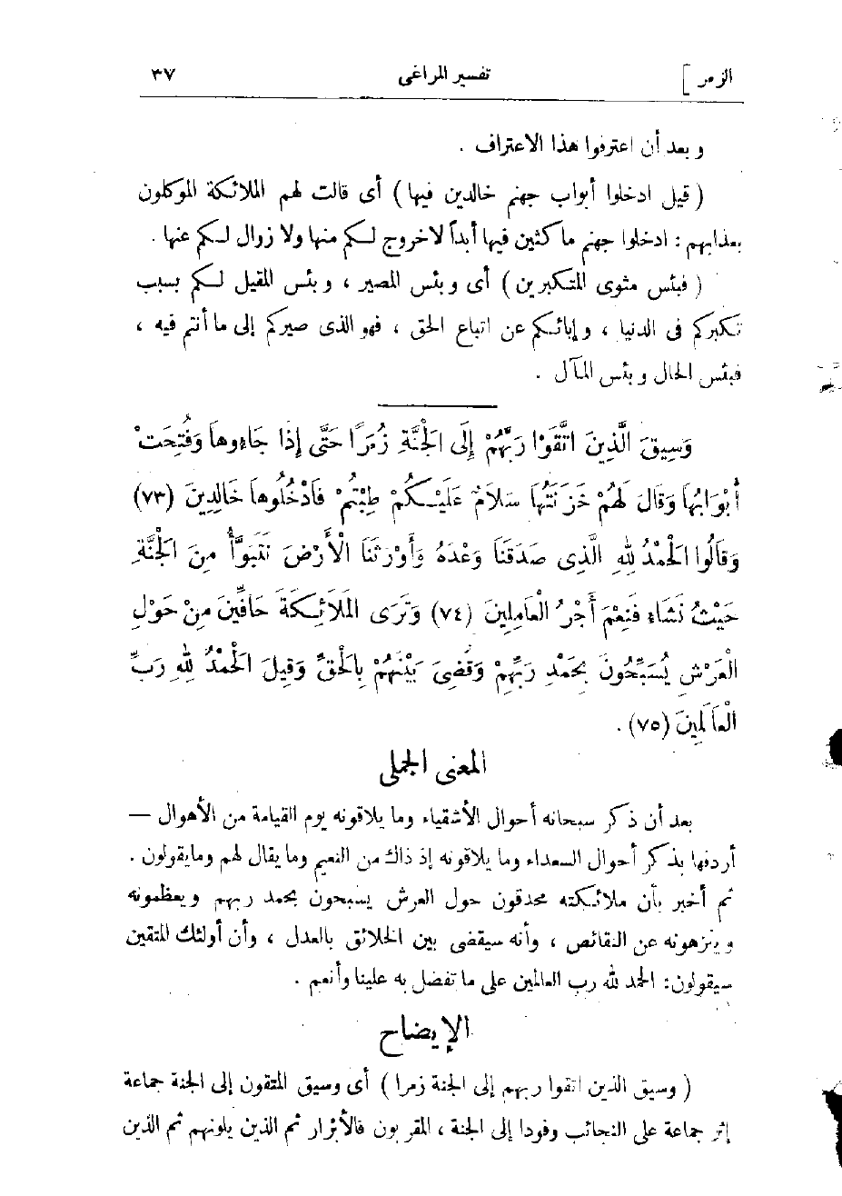 (وَسِيقَ الَّذِينَ اتَّقَوْا رَبَّهُمْ إِلَى الْجَنَّةِ زُمَراً) أي وسيق المتقون إلى الجنة جماعة إثر جماعة على النجائب وفودا إلى الجنة، المقربون فالأبرار ثم الذين يلونهم ثم الذين