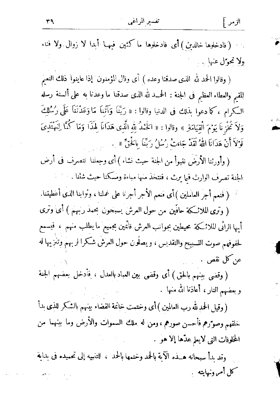 (وَتَرَى الْمَلائِكَةَ حَافِّينَ مِنْ حَوْلِ الْعَرْشِ يُسَبِّحُونَ بِحَمْدِ رَبِّهِمْ) أي وترى أيها الرائي الملائكة محيطين بجوانب العرش، قائمين بجميع ما يطلب منهم، فيسمع لحفوفهم صوت التسبيح والتقديس، ويصلّون حول العرش، شكرا لربهم وتنزيها له عن كل نقص.
