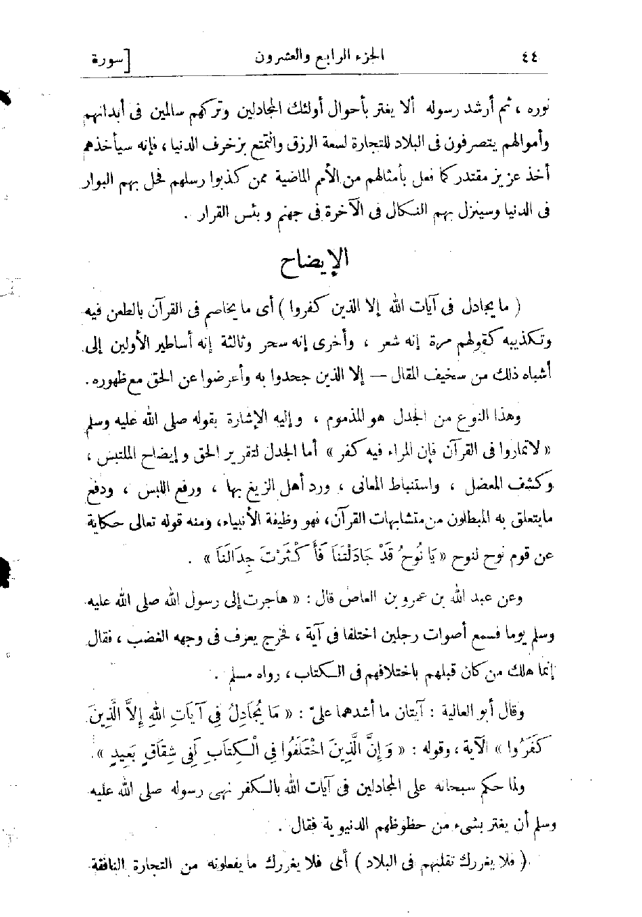 وعن عبد الله بن عمرو بن العاص قال: «هاجرت إلى رسول الله صلّى الله عليه وسلم يوما فسمع أصوات رجلين اختلفا في آية، فخرج يعرف في وجهه الغضب، فقال إنما هلك من كان قبلهم باختلافهم في الكتاب» رواه مسلم.