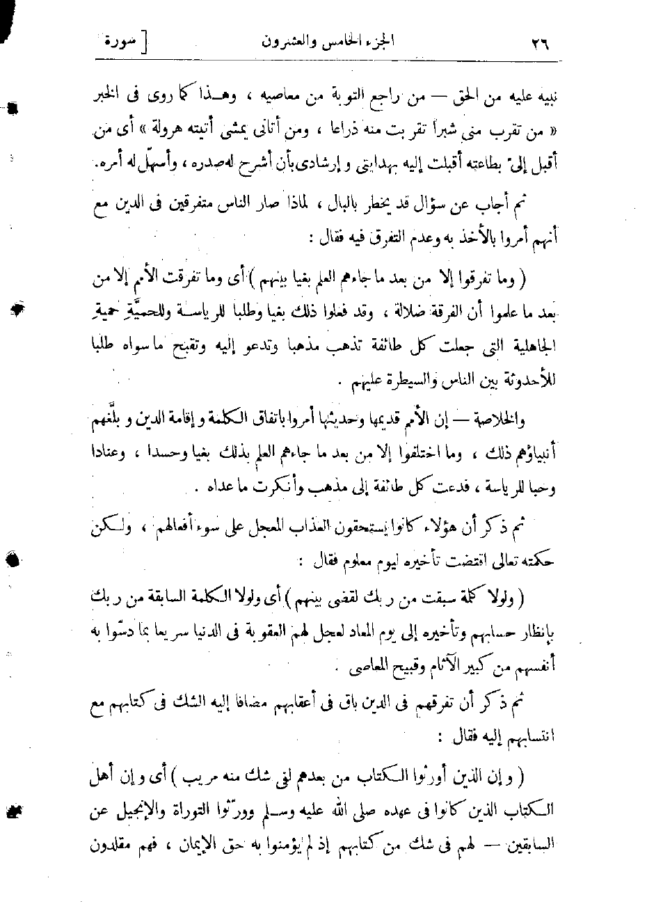 (وَما تَفَرَّقُوا إِلَّا مِنْ بَعْدِ ما جاءَهُمُ الْعِلْمُ بَغْياً بَيْنَهُمْ) أي وما تفرقت الأمم إلا من بعد ما علموا أن الفرقة ضلالة، وقد فعلوا ذلك بغيا وطلبا للرياسة، وللحميّة حمية الجاهلية التي جعلت كل طائفة تذهب مذهبا وتدعو إليه وتقبح ما سواه، طلبا للأحدوثة بين الناس والسيطرة عليهم.