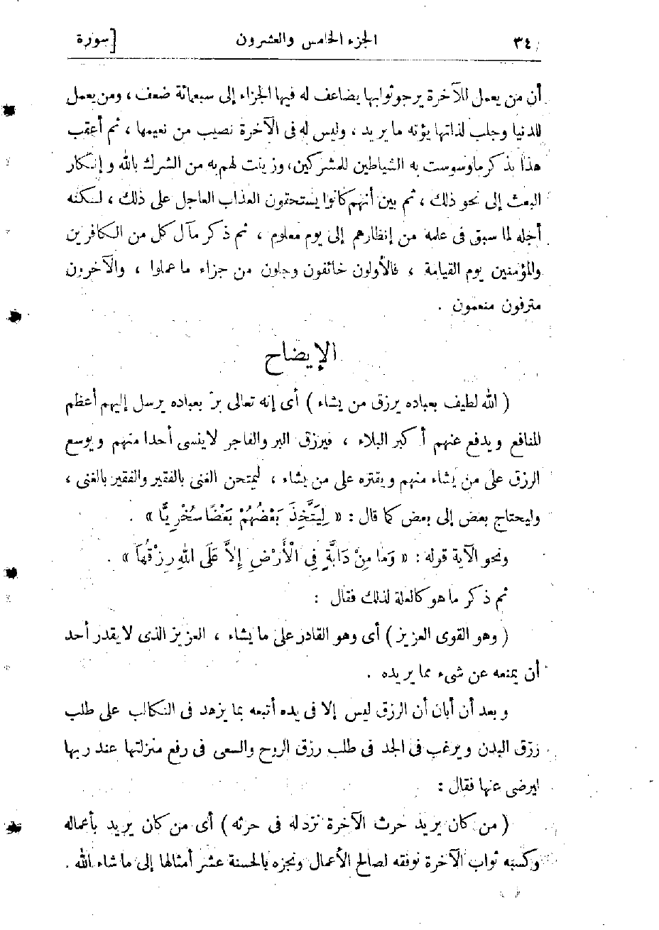 يعمل للآخرة يرجو ثوابها يضاعف له فيها الجزاء إلى سبعمائة ضعف، ومن يعمل للدنيا وجلب لذاتها يؤته ما يريد، وليس له فى الآخرة نصيب من نعيمها، ثم أعقب هذا بذكر ما وسوست به الشياطين للمشركين، وزينت لهم به من الشرك بالله وإنكار البعث إلى نحو ذلك، ثم بين أنهم كانوا يستحقون العذاب العاجل على ذلك، لكنه أجّله لما سبق فى علمه من إنظارهم إلى يوم معلوم، ثم ذكر مآل كل من الكافرين والمؤمنين يوم القيامة، فالأولون خائفون وجلون من جزاء ما عملوا، والآخرون مترفون منعّمون.