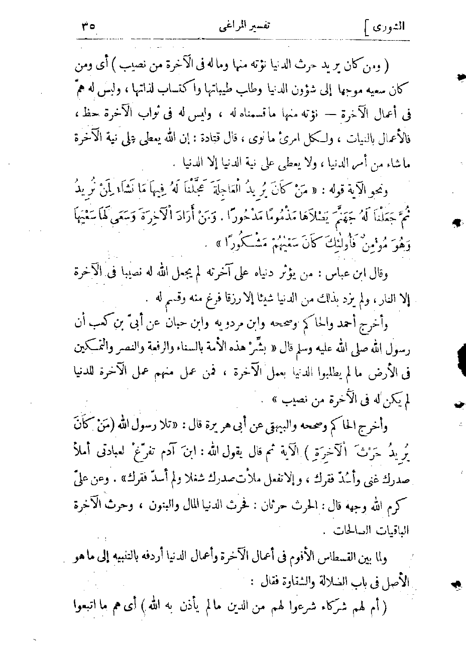 وأخرج الحاكم وصححه والبيهقي عن أبى هريرة قال: «تلا رسول الله صلّى الله عليه وسلم (مَنْ كانَ يُرِيدُ حَرْثَ الْآخِرَةِ) لآية ثم قال يقول الله: ابن آدم تفرّغ لعبادتى أملأ صدرك غنى وأسدّ فقرك، وإلا تفعل ملأت صدرك شغلا ولم أسدّ فقرك» .