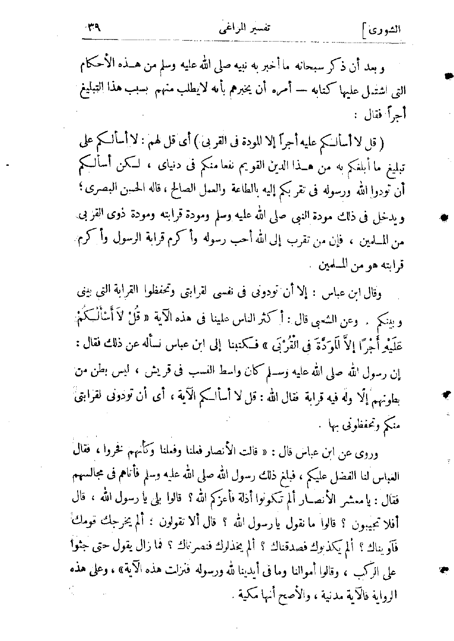 وقال ابن عباس: إلا أن تودونى فى نفسى لقرابتى منكم، وتحفظوا القرابة التي بينى وبينكم. وعن الشعبي قال: أكثر الناس علينا فى هذه الآية «قُلْ لا أَسْئَلُكُمْ عَلَيْهِ أَجْراً إِلَّا الْمَوَدَّةَ فِي الْقُرْبى» فكتبنا إلى ابن عباس نسأله عن ذلك فقال: إن رسول الله صلّى الله عليه وسلّم كان واسط النسب فى قريش، ليس بطن من بطونهم إلّا وله فيه قرابة فقال الله: قل لا أسألكم الآية، أي أن تودونى لقرابتى منكم وتحفظوني بها.