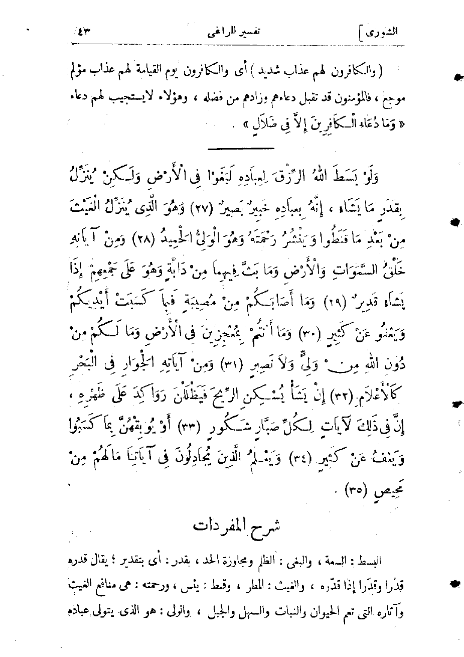 وَلَوْ بَسَطَ اللَّهُ الرِّزْقَ لِعِبادِهِ لَبَغَوْا فِي الْأَرْضِ وَلكِنْ يُنَزِّلُ بِقَدَرٍ ما يَشاءُ إِنَّهُ بِعِبادِهِ خَبِيرٌ بَصِيرٌ (27) وَهُوَ الَّذِي يُنَزِّلُ الْغَيْثَ مِنْ بَعْدِ ما قَنَطُوا وَيَنْشُرُ رَحْمَتَهُ وَهُوَ الْوَلِيُّ الْحَمِيدُ (28) وَمِنْ آياتِهِ خَلْقُ السَّماواتِ وَالْأَرْضِ وَما بَثَّ فِيهِما مِنْ دابَّةٍ وَهُوَ عَلى جَمْعِهِمْ إِذا يَشاءُ قَدِيرٌ (29) وَما أَصابَكُمْ مِنْ مُصِيبَةٍ فَبِما كَسَبَتْ أَيْدِيكُمْ وَيَعْفُوا عَنْ كَثِيرٍ (30) وَما أَنْتُمْ بِمُعْجِزِينَ فِي الْأَرْضِ وَما لَكُمْ مِنْ دُونِ اللَّهِ مِنْ وَلِيٍّ وَلا نَصِيرٍ (31)