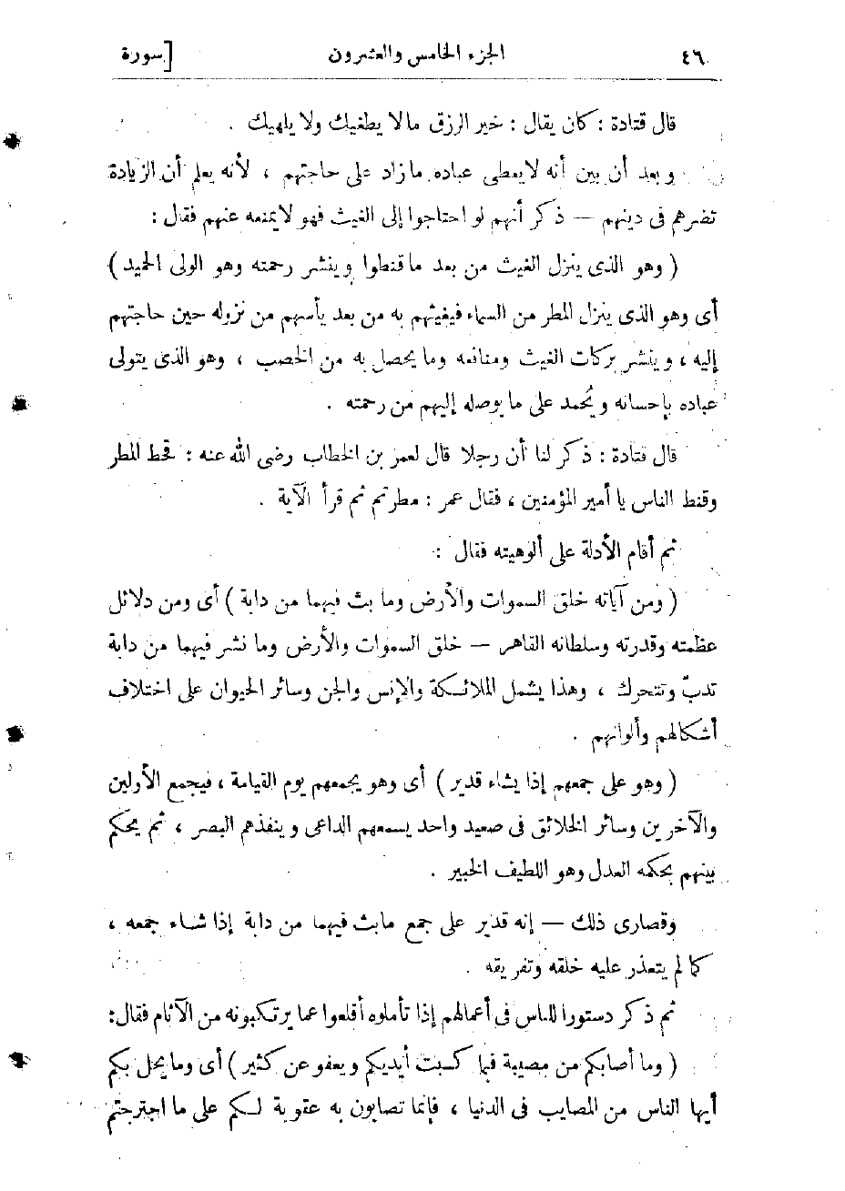 قال قتادة: ذكر لنا أن رجلا قال لعمر بن الخطاب رضى الله عنه: قحط المطر وقنط الناس يا أمير المؤمنين، فقال عمر: مطرتم ثم قرأ الآية.