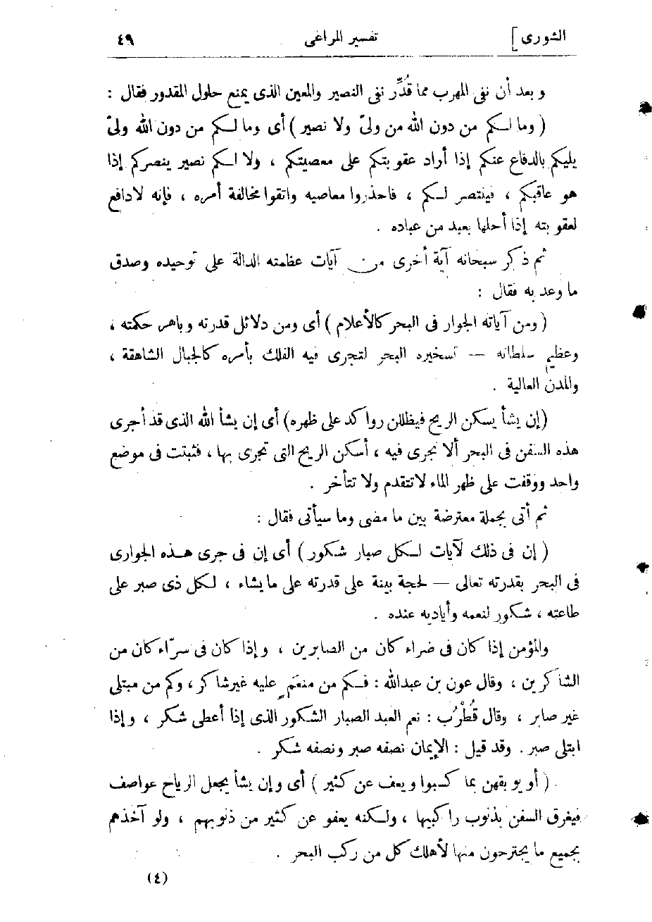 (إِنَّ فِي ذلِكَ لَآياتٍ لِكُلِّ صَبَّارٍ شَكُورٍ) أي إن فى جرى هذه الجواري فى البحر بقدرته تعالى- لحجة بينة على قدرته على ما يشاء، لكل ذى صبر على طاعته، شكور لنعمه وأياديه عنده.