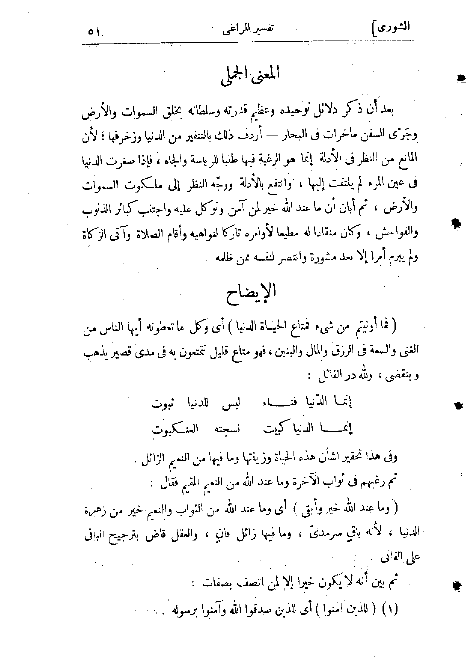 بعد أن ذكر دلائل توحيده وعظيم قدرته وسلطانه بخلق السموات والأرض وجرى السفن ماخرات فى البحار- أردف ذلك التنفير من الدنيا وزخرفها، لأن المانع من النظر فى الأدلة إنما هو الرغبة فيها طلبا للرياسة والجاه، فإذا صغرت الدنيا فى عين المرء لم يلتفت إليها، وانتفع بالأدلة ووجّه النظر إلى ملكوت السموات والأرض، ثم أبان أن ما عند الله خير لمن آمن به، وتوكل عليه، واجتنب كبائر الذنوب والفواحش، وكان منقادا له مطيعا لأوامره، تاركا لنواهيه، وأقام الصلاة وآتى الزكاة، ولم يبرم أمرا إلا بعد مشورة، وانتصر لنفسه ممن ظلمه.