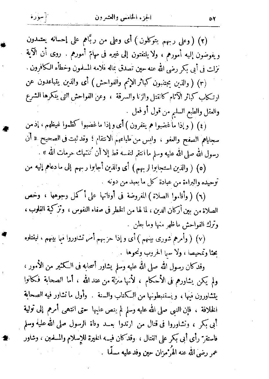 (7) (وَأَمْرُهُمْ شُورى بَيْنَهُمْ) أي وإذا حزبهم أمر تشاوروا فيما بينهم، ليقتلوه بحثا وتمحيصا، ولا سيما الحروب ونحوها.
