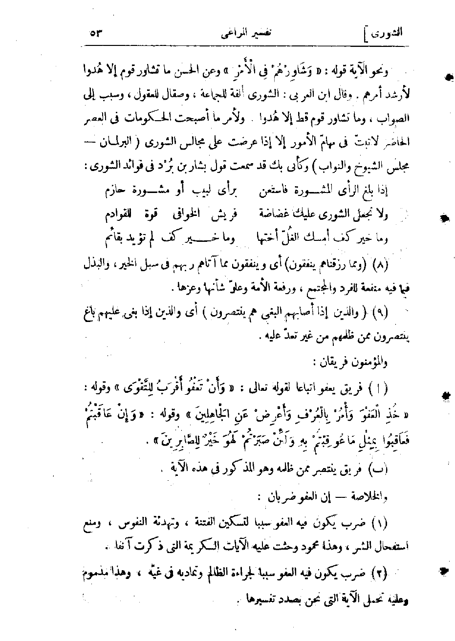 ونحو الآية قوله: «وَشاوِرْهُمْ فِي الْأَمْرِ» وعن الحسن: ما تشاور قوم إلا هدوا لأرشد أمرهم. وقال ابن العربي: الشورى ألفة للجماعة، وصقال للعقول، وسبب إلى الصواب، وما تشاور قوم قط إلا هدوا. ولأمر ما أصبحت الحكومات فى العصر الحاضر لا تبتّ فى مهام الأمور إلا إذا عرضت على مجالس الشورى (البرلمان- مجلس الشيوخ والنواب) وكأنى بك قد سمعت قول بشار بن برد فى فوائد الشورى: