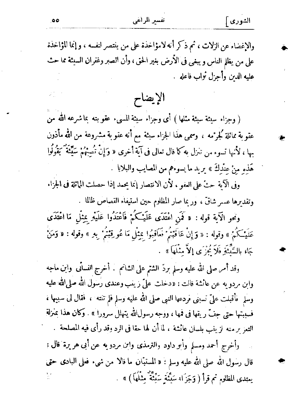 وأخرج أحمد ومسلم وأبو داود والترمذي وابن مردويه عن أبى هريرة قال: قال رسول الله صلّى الله عليه وسلّم: المستبّان ما قالا من شىء فعلى البادي حتى يعتدى المظلوم ثم قرأ (وَجَزاءُ سَيِّئَةٍ سَيِّئَةٌ مِثْلُها) »
