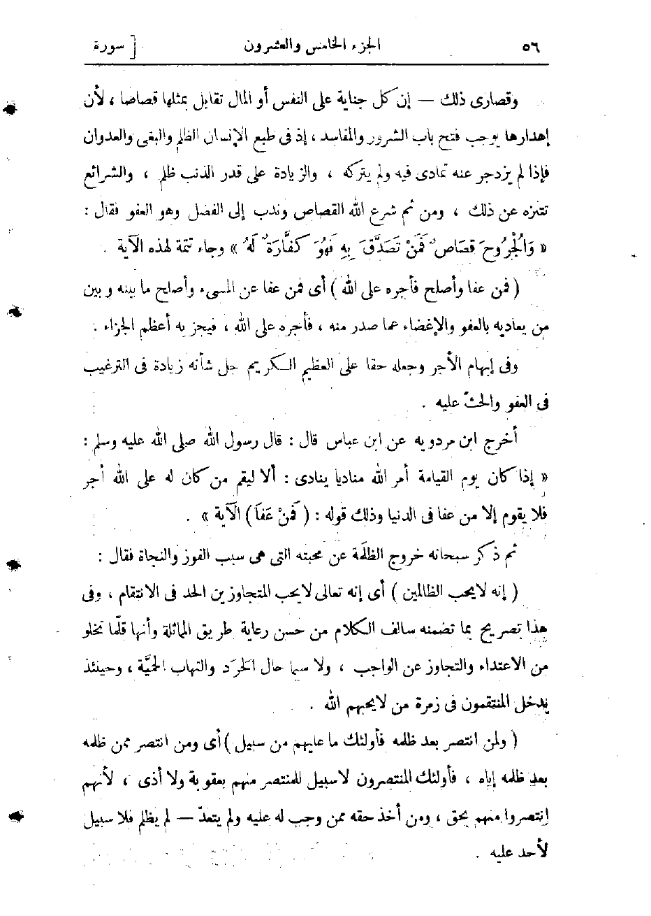 أخرج ابن مردويه عن ابن عباس قال: قال رسول الله صلّى الله عليه وسلم: «إذا كان يوم القيامة أمر الله مناديا ينادى: ألا ليقم من كان له على الله أجر فلا يقوم إلا من عفا فى الدنيا وذلك قوله: (فَمَنْ عَفا) الآية» .