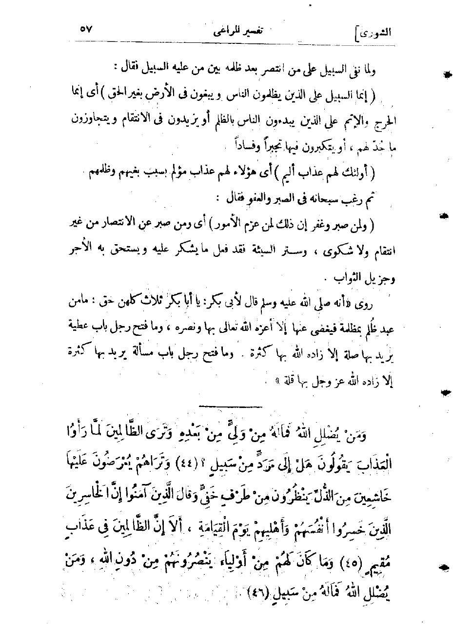 (إِنَّمَا السَّبِيلُ عَلَى الَّذِينَ يَظْلِمُونَ النَّاسَ وَيَبْغُونَ فِي الْأَرْضِ بِغَيْرِ الْحَقِّ) أي إنما الحرج والإثم على الذين يبدءون الناس بالظلم، أو يزيدون فى الانتقام ويتجاوزون ما حدّ لهم، أو يتكبرون فى الأرض تجبرا وفسادا.