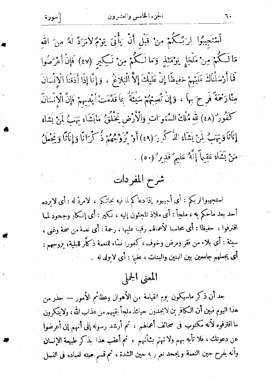 استجيبوا لربكم: أي أجيبوه إذا دعاكم إلى ما فيه نجاتكم، لا مردّ له: أي لا يرده أحد بعد ما حكم به، ملجأ: أي ملاذ تلجئون إليه، نكير: أي إنكار وجحود لما اقترفتم، حفيظا: أي محاسبا لأعمالهم رقيبا عليها، رحمة: أي نعمة من صحة وغنى، سيئة: أي بلاء من فقر ومرض وخوف، كفور: نسّاء للنعمة ذكّار للبلية، يزوجهم أي يجعلهم جامعين بين البنين والبنات، عقيما: أي لا يولد له.