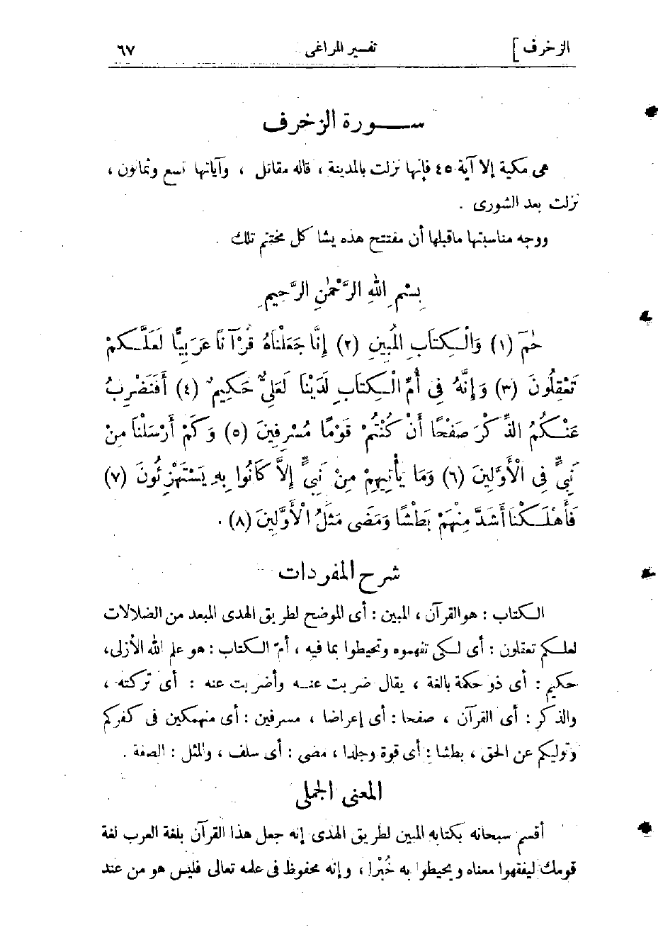 الكتاب: هو القرآن، المبين: أي الموضح لطريق الهدى المبعد من الضلالات، لعلكم تعقلون: أي لكى تفهموه وتحيطوا بما فيه، أمّ الكتاب: هو علم الله الأزلى، حكيم: