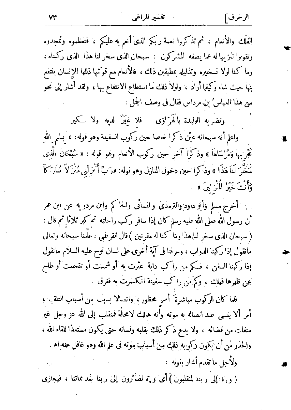 قال القرطبي: علّمنا سبحانه وتعالى ما نقول إذا ركبنا الدواب، وعرّفنا فى آية أخرى على لسان نوح عليه السلام ما نقول إذا ركبنا السفن، فكم من راكب دابة عثرت به أو شمست أو تقحّمت أو طاح عن ظهرها فهلك، وكم من راكب سفينة انكسرت به فغرق.
