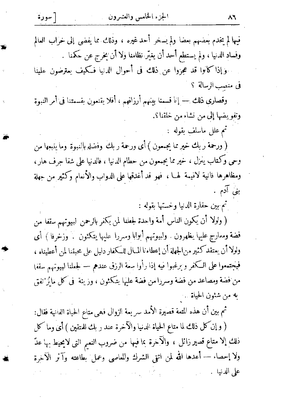(وَلَوْلا أَنْ يَكُونَ النَّاسُ أُمَّةً واحِدَةً لَجَعَلْنا لِمَنْ يَكْفُرُ بِالرَّحْمنِ لِبُيُوتِهِمْ سُقُفاً مِنْ فِضَّةٍ وَمَعارِجَ عَلَيْها يَظْهَرُونَ. وَلِبُيُوتِهِمْ أَبْواباً وَسُرُراً عَلَيْها يَتَّكِؤُنَ. وَزُخْرُفاً) أي ولولا أن يعتقد كثير من الجهلة أن إعطاءنا المال للكفار دليل على محبتنا لمن أعطيناه، فيجتمعوا على الكفر، ويرغبوا فيه، إذا رأوا سعة الرزق عندهم- لجعلنا لبيوتهم سقفا من فضة، ومصاعد من فضة، وسررا من فضة، عليها يتكئون، وزينة فى كل ما يرتفق به من شئون الحياة.