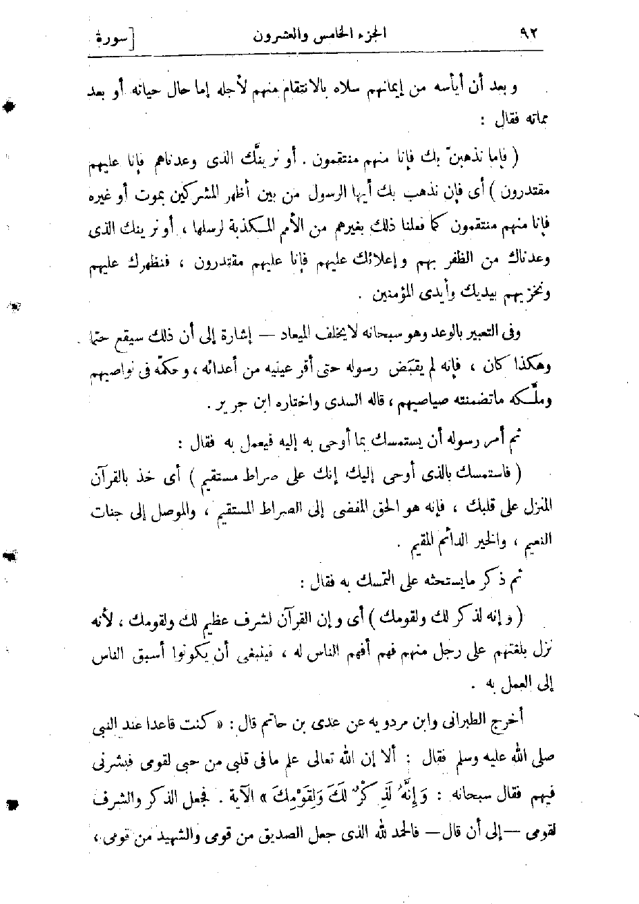 أخرج الطبراني وابن مردويه عن عدى بن حاتم قال: «كنت قاعدا عند النبي صلى الله عليه وسلّم فقال: ألا إن الله تعالى علم ما فى قلبى من حبى لقومى فبشرنى فيهم فقال سبحانه: وإنّه لذكر لك ولقومك» الآية. فجعل الذكر والشرف لقومى- إلى أن قال- فالحمد لله الذي جعل الصدّيق من قومى والشهيد من قومى،