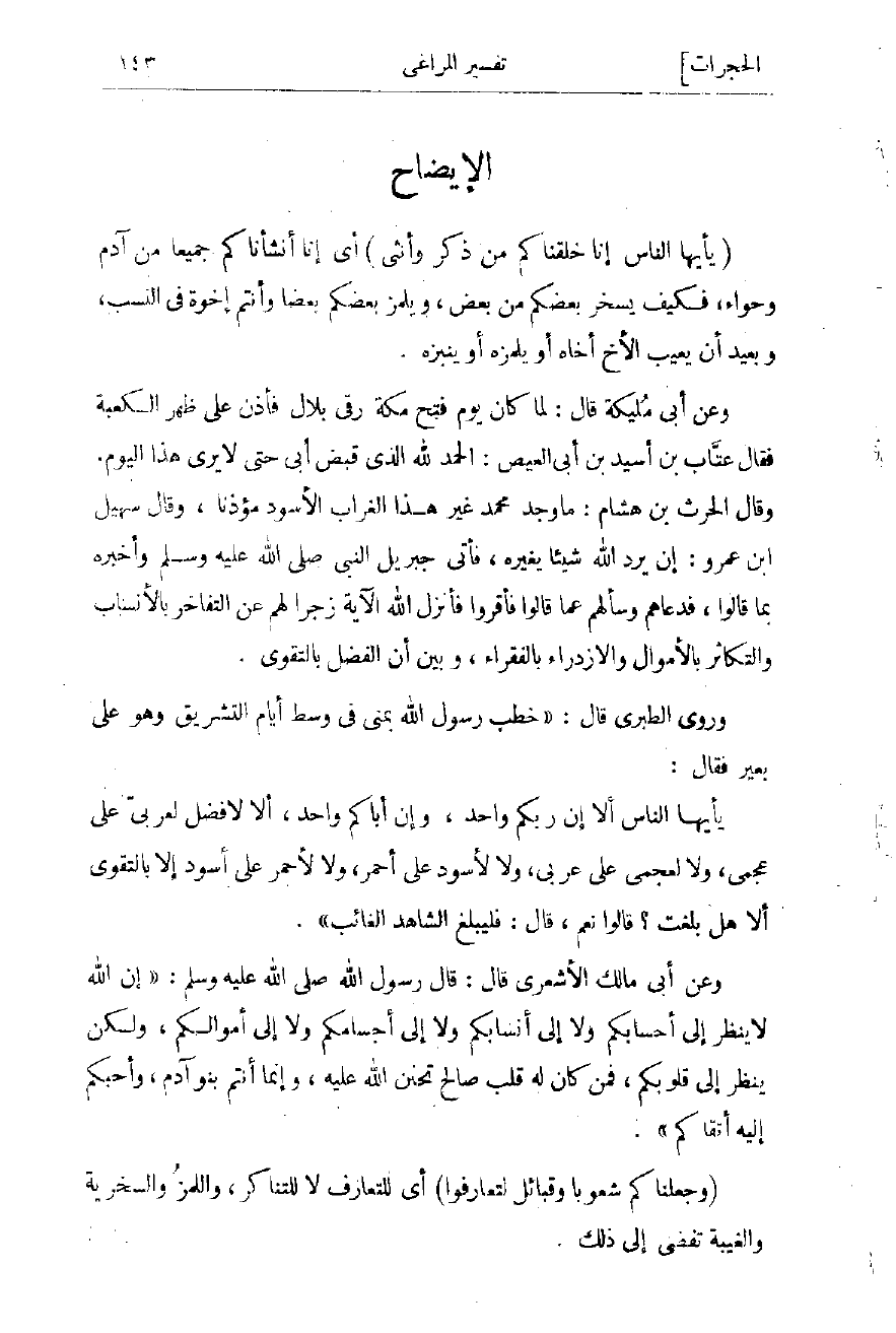 يا أيها الناس ألا إن ربكم واحد، وإن أباكم واحد، ألا لا فضل لعربى على عجمى، ولا لعجمى على عربى، ولا لأسود على أحمر، ولا لأحمر على أسود إلا بالتقوى ألا هل بلغت؟ قالوا نعم، قال: فليبلغ الشاهد الغائب» .