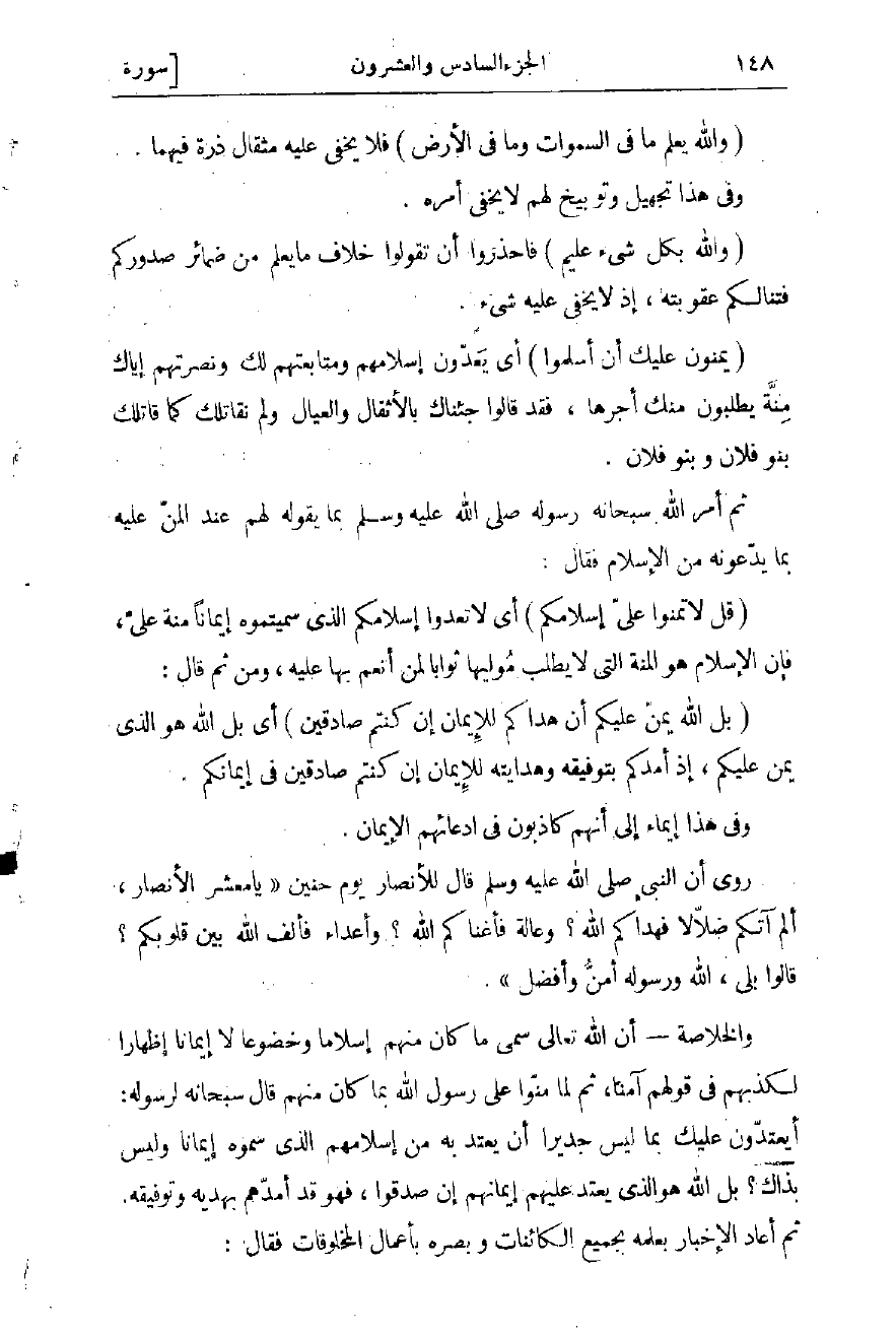 روى أن النبي صلّى الله عليه وسلّم قال للأنصار يوم حنين «يا معشر الأنصار، ألم آتكم ضلّالا فهداكم الله؟ وعالة فأغناكم الله؟ وأعداء فألف الله بين قلوبكم؟ قالوا بلى، الله ورسوله أمنّ وأفضل» .