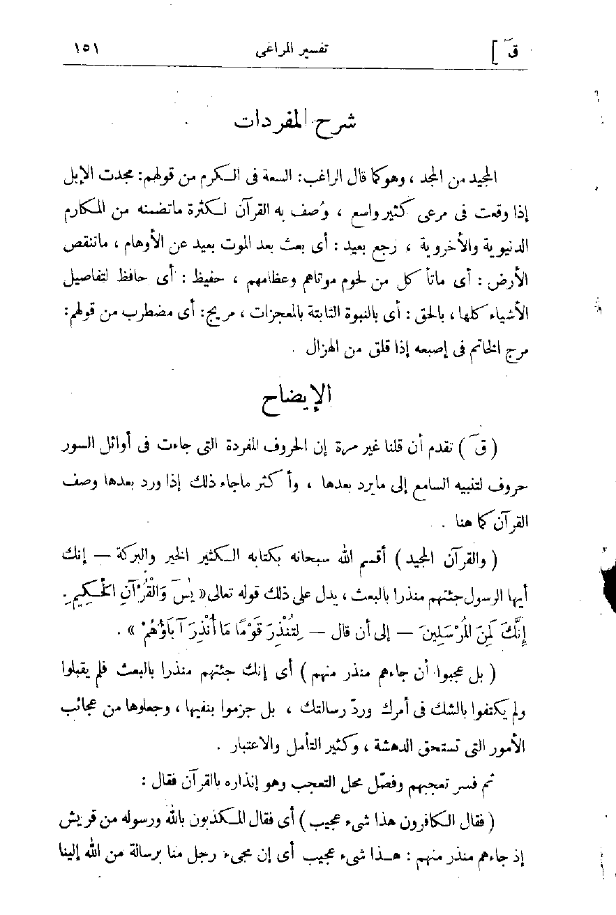 (ق) تقدم أن قلنا غير مرة إن الحروف المفردة. التي جاءت فى أوائل السور حروف لتنبيه السامع إلى ما يرد بعدها، وأكثر ما جاء ذلك إذا ورد بعدها وصف القرآن كما هنا.