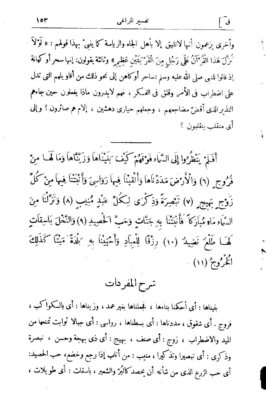 بنيناها: أي أحكمنا بناءها، فجعلناها بغير عمد، وزيناها: أي بالكواكب، فروج: أي شقوق، مددناها: أي بسطناها، رواسى: أي جبالا ثوابت تمنعها من الميد والاضطراب، زوج: أي صنف، بهيج: أي ذى بهجة وحسن، تبصرة وذكرى: