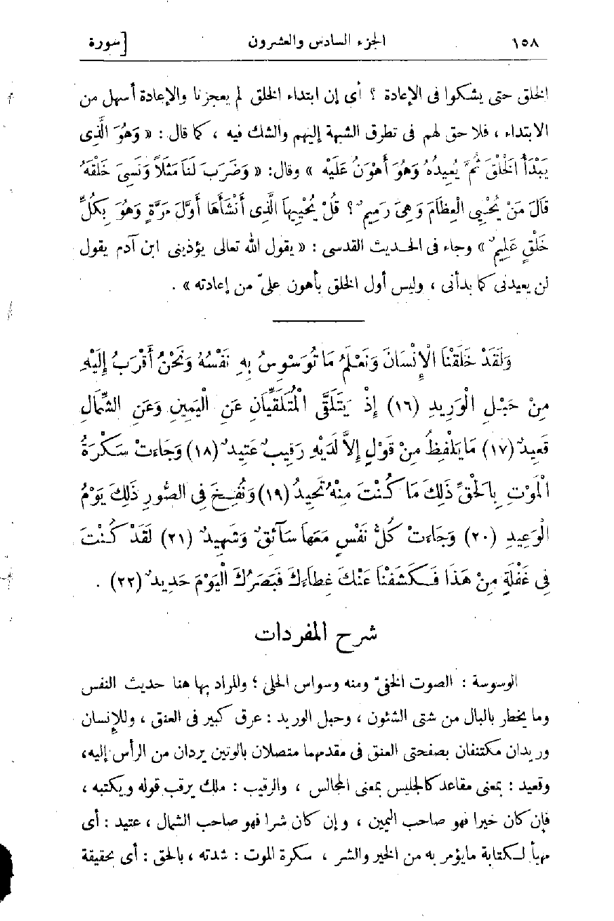 الوسوسة: الصوت الخفىّ ومنه وسواس الحلي والمراد بها هنا حديث النفس وما يخطر بالبال من شتى الشئون، وحبل الوريد: عرق كبير فى العنق، وللانسان وريدان مكتنفان بصفحتى العنق فى مقدمهما متصلان بالوتين يردان من الرأس إليه، وقعيد: