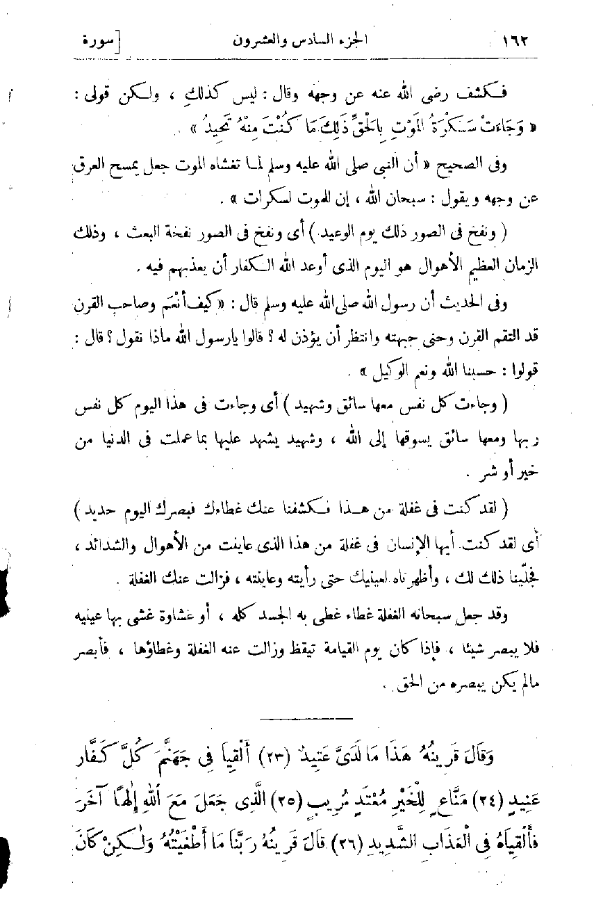 فكشف رضى الله عنه عن وجهه وقال: ليس كذلك، ولكن قولى: «وَجاءَتْ سَكْرَةُ الْمَوْتِ بِالْحَقِّ ذلِكَ ما كُنْتَ مِنْهُ تَحِيدُ» .