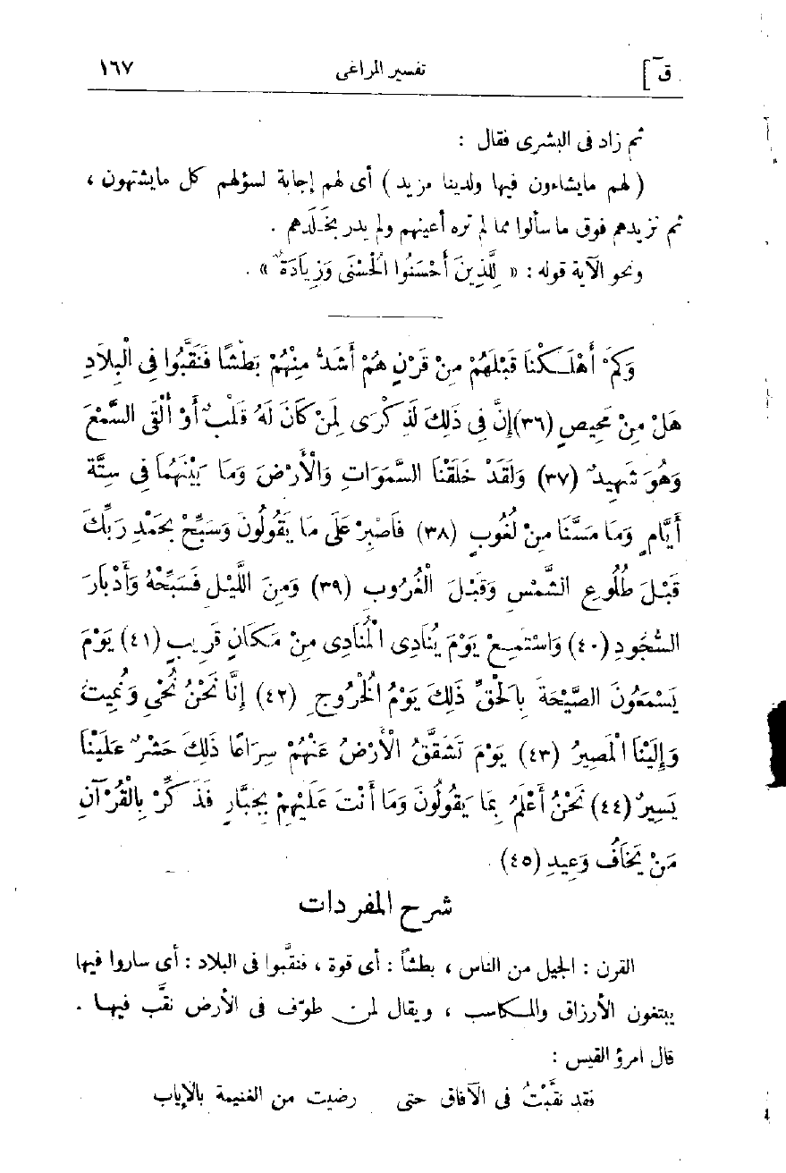 القرن: الجيل من الناس، بطشا: أي قوة، فنقبوا فى البلاد: أي ساروا فيها يبتغون الأرزاق والمكاسب، ويقال لمن طوّف فى الأرض نقّب فيها، قال امرؤ القيس:
