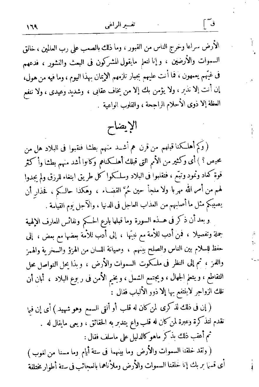(وَكَمْ أَهْلَكْنا قَبْلَهُمْ مِنْ قَرْنٍ هُمْ أَشَدُّ مِنْهُمْ بَطْشاً فَنَقَّبُوا فِي الْبِلادِ هَلْ مِنْ مَحِيصٍ؟) أي وكثير من الأمم التي قبلك أهلكناهم وكانوا أشد من قومك بطشا، وأكثر منهم قوة، كعاد وثمود وتبّع، فتقلبوا فى البلاد وسلكوا كل طريق ابتغاء للرزق، ولم يجدوا لهم من أمر الله مهربا ولا ملجأ حين حمّ القضاء، وهكذا حالكم، فحذار أن يصيبكم مثل ما أصابهم من العذاب العاجل فى الدنيا، والآجل يوم القيامة.