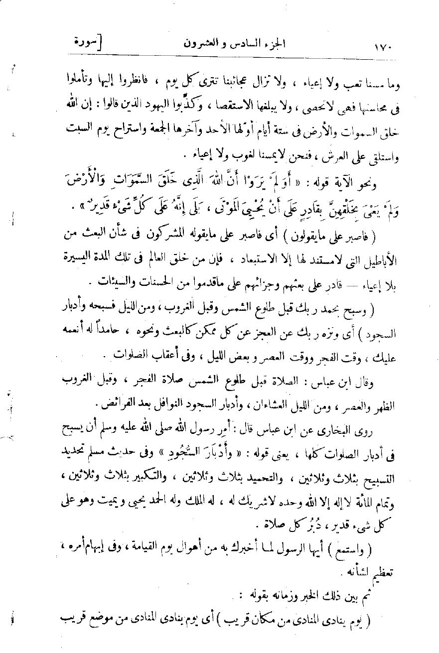 روى البخاري عن ابن عباس قال: أمر رسول الله صلى الله عليه وسلّم أن يسبح فى أدبار الصلوات كلها، يعنى قوله: «وَأَدْبارَ السُّجُودِ»