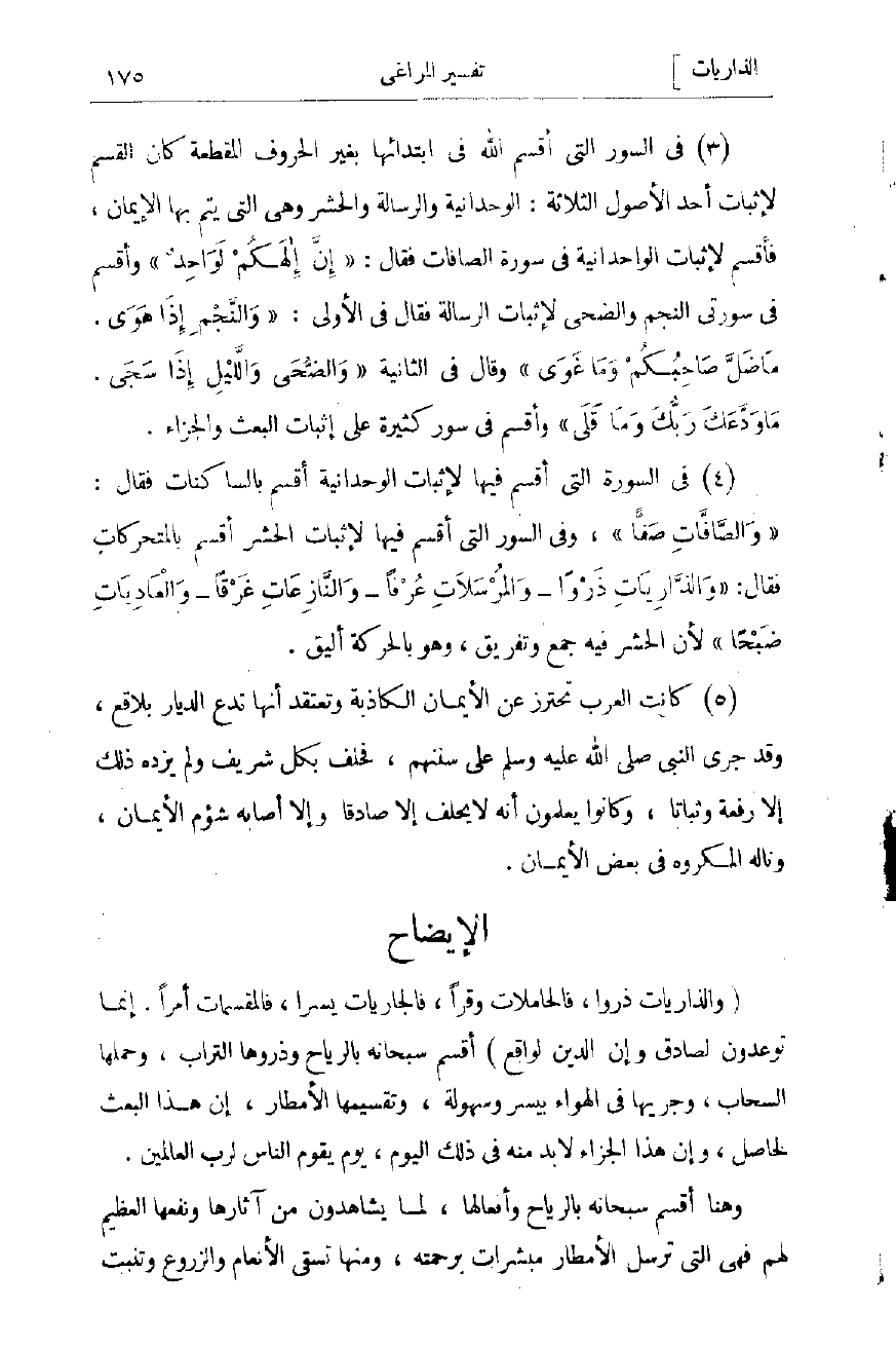 (3) فى السور التي أقسم الله فى ابتدائها بغير الحروف المقطعة كان القسم لإثبات أحد الأصول الثلاثة: الوحدانية والرسالة والحشر وهى التي يتم بها الإيمان، فأقسم لإثبات الوحدانية فى سورة الصافات فقال: «إِنَّ إِلهَكُمْ لَواحِدٌ» وأقسم فى سورتى النجم والضحى لإثبات الرسالة فقال فى الأولى: «وَالنَّجْمِ إِذا هَوى. ما ضَلَّ صاحِبُكُمْ وَما غَوى» وقال فى الثانية: «وَالضُّحى وَاللَّيْلِ إِذا سَجى ما وَدَّعَكَ رَبُّكَ وَما قَلى» وأقسم فى سور كثيرة على إثبات البعث والجزاء.