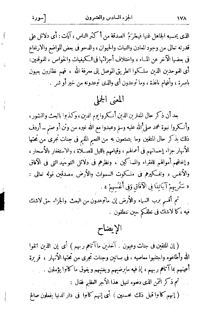 بعد أن ذكر حال المغترين الذين أنكروا يوم الدين، وكذبوا بالبعث والنشور، وأنكروا نبوة محمد صلى الله عليه وسلّم وعبدوا مع الله غيره من وثن أو صنم- أردف ذلك ذكر حال المتقين وما يتمتعون به من النعيم المقيم فى جنات تجرى من تحتها الأنهار، جزاء إحسانهم فى أعمالهم، وقيامهم بالليل للصلاة، والاستغفار بالأسحار، وإنفاقهم أموالهم للفقراء والمساكين، ونظرهم فى دلائل التوحيد التي فى الآفاق والأنفس، وتفكيرهم فى ملكوت السموات والأرض مصدقين قوله تعالى: «سَنُرِيهِمْ آياتِنا فِي الْآفاقِ وَفِي أَنْفُسِهِمْ» .