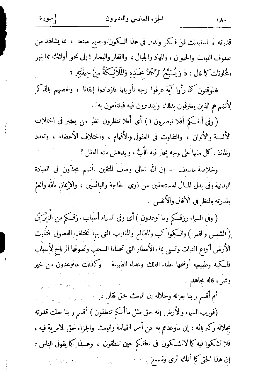 (وَفِي السَّماءِ رِزْقُكُمْ وَما تُوعَدُونَ) أي وفى السماء أسباب رزقكم من النيّرين (الشمس والقمر) والكواكب والمطالع والمغارب التي بها تختلف الفصول فتنبت الأرض أنواع النبات وتسقى بماء الأمطار التي تحملها السحب وتسوقها الرياح لأسباب فلكية وطبيعية أوضحها علماء الفلك وعلماء الطبيعة. وكذلك ما توعدون من خير وشر، قاله مجاهد.