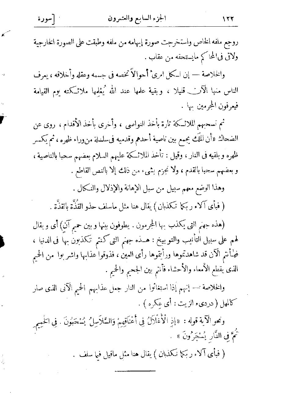 ونحو الآية قوله: «إِذِ الْأَغْلالُ فِي أَعْناقِهِمْ وَالسَّلاسِلُ يُسْحَبُونَ. فِي الْحَمِيمِ ثُمَّ فِي النَّارِ يُسْجَرُونَ» .