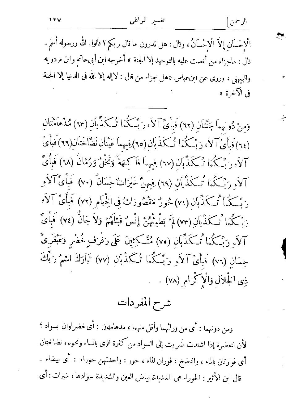 ومن دونهما: أي من ورائهما وأقل منهما، مدهامتان: أي خضراوان بسواد لأن الخضرة إذا اشتدت ضربت إلى السواد من كثرة الري بالماء ونحوه، نضاختان: