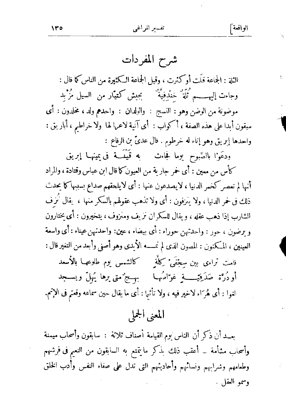 بعد أن ذكر أن الناس يوم القيامة أصناف ثلاثة: سابقون وأصحاب ميمنة وأصحاب مشأمة- أعقب ذلك بذكر ما يتمتع به السابقون من النعيم فى فرشهم وطعامهم وشرابهم ونسائهم وأحاديثهم التي تدل على صفاء النفس، وأدب الخلق، وسمو العقل.