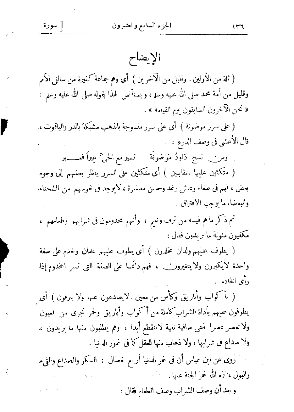 (بِأَكْوابٍ وَأَبارِيقَ وَكَأْسٍ مِنْ مَعِينٍ. لا يُصَدَّعُونَ عَنْها وَلا يُنْزِفُونَ) أي يطوفون عليهم بأداة الشراب كاملة من أكواب وأباريق وخمر تجرى من العيون ولا تعصر عصرا فهى صافية نقية لا تنقطع أبدا، وهم يطلبون منها ما يريدون، ولا صداع فى شرابها، ولا ذهاب منها للعقل كما فى خمور الدنيا.
