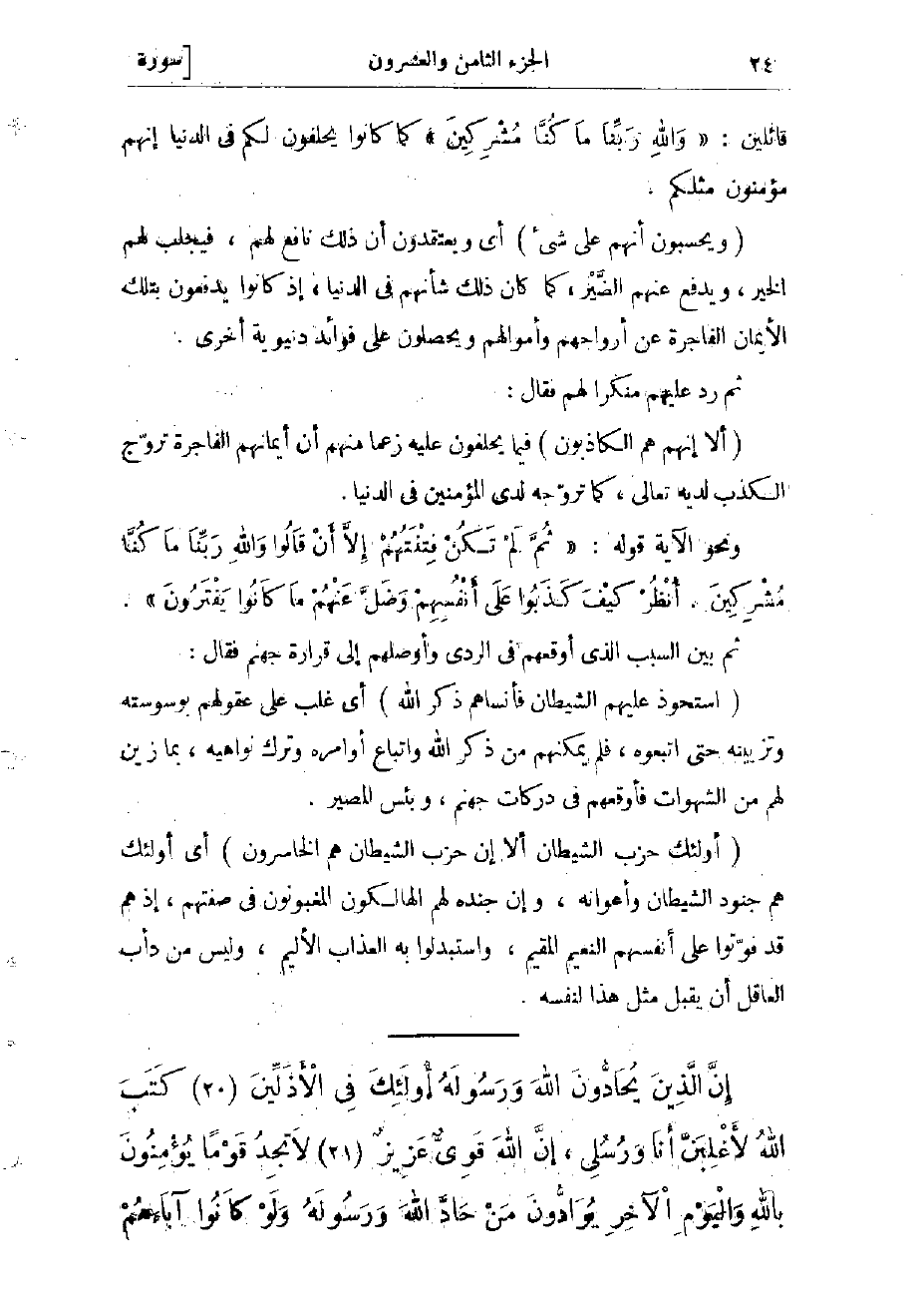 (أُولئِكَ حِزْبُ الشَّيْطانِ أَلا إِنَّ حِزْبَ الشَّيْطانِ هُمُ الْخاسِرُونَ) أي أولئك هم جنود الشيطان وأعوانه، وإن جنده لهم الهالكون المغبونون فى صفتهم، إذ هم قد فوّتوا على أنفسهم النعيم المقيم، واستبدلوا به العذاب الأليم، وليس من دأب العاقل أن يقبل مثل هذا لنفسه.