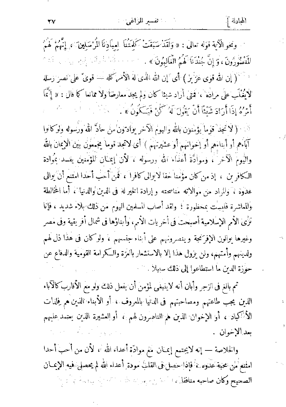 (لا تَجِدُ قَوْماً يُؤْمِنُونَ بِاللَّهِ وَالْيَوْمِ الْآخِرِ يُوادُّونَ مَنْ حَادَّ اللَّهَ وَرَسُولَهُ وَلَوْ كانُوا آباءَهُمْ أَوْ أَبْناءَهُمْ أَوْ إِخْوانَهُمْ أَوْ عَشِيرَتَهُمْ) أي لا تجد قوما يجمعون بين الإيمان بالله واليوم الآخر، وموادّة أعداء الله ورسوله، لأن إيمان المؤمنين يفسد بموادة الكافرين، إذ من كان مؤمنا حقا لا يوالى كافرا، فمن أحب أحدا امتنع أن يوالى عدوه، والمراد من موالاته مناصحته وإرادة الخير له فى الدين والدنيا، أما المخالطة والمعاشرة فليست بمحظورة ولقد أصاب المسلمين اليوم من ذلك بلاء شديد، فإنا نرى الأمم الإسلامية أصبحت فى أخريات الأمم، وأبناؤها فى شمال إفريقية وفى مصر وغيرها يوالون الإفربحة وينصرونهم على أبناء جنسهم، ولو كان فى هذا ذل لهم ولدينهم وأمتهم، ولن يزول هذا إلا بالاستشعار بالعزة والكرامة القومية والدفاع عن حوزة الدين ما استطاعوا إلى ذلك سبيلا.