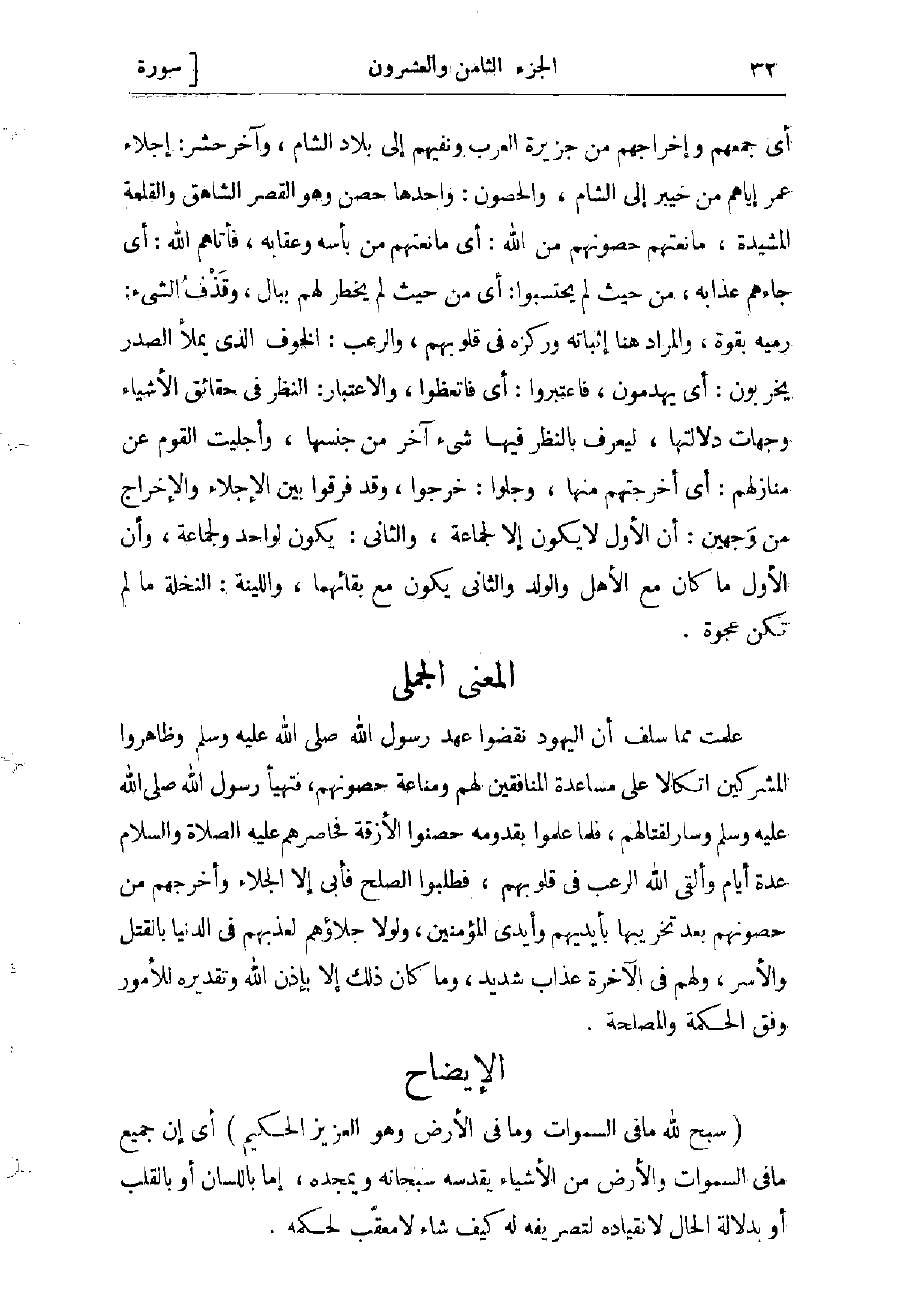 علمت مما سلف أن اليهود نقضوا عهد رسول الله صلى الله عليه وسلم وظاهروا المشركين اتكالا على مساعدة المنافقين لهم ومناعة حصونهم، فتهيأ رسول الله صلى الله عليه وسلم وسار لقتالهم، فلما علموا بقدومه حصنوا الأزقة فحاصرهم عليه الصلاة والسلام عدة أيام وألقى الله الرعب فى قلوبهم، فطلبوا الصلح فأبى إلا الجلاء وأخرجهم من حصونهم بعد تخريبها بأيديهم وأيدى المؤمنين، ولولا جلاؤهم لعذبهم فى الدنيا بالقتل والأسر، ولهم فى الآخرة عذاب شديد، وما كان ذلك إلا بإذن الله وتقديره للأمور وفق الحكمة والمصلحة.