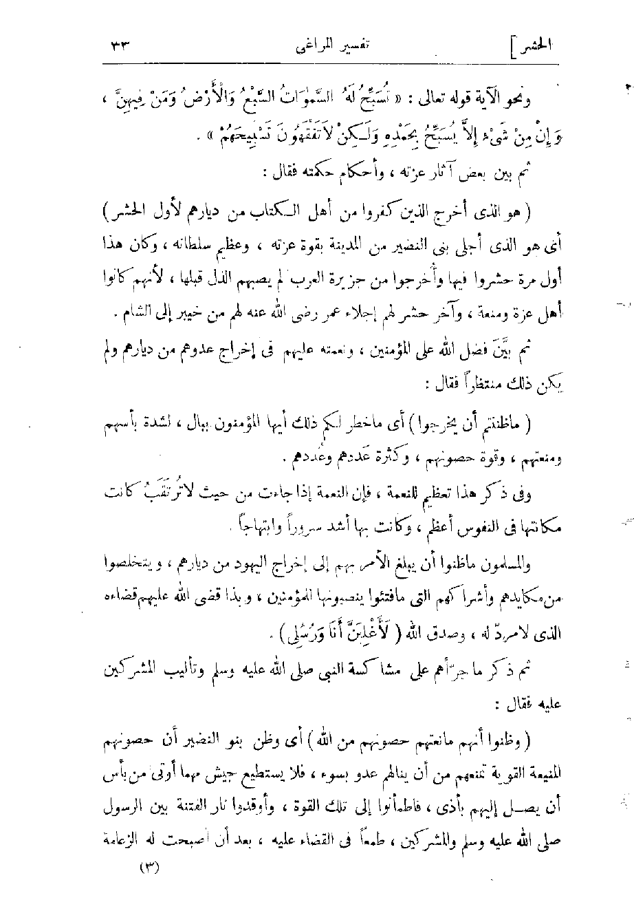 (هُوَ الَّذِي أَخْرَجَ الَّذِينَ كَفَرُوا مِنْ أَهْلِ الْكِتابِ مِنْ دِيارِهِمْ لِأَوَّلِ الْحَشْرِ) أي هو الذي أجلى بنى النضير من المدينة بقوة عزته، وعظيم سلطانه، وكان هذا أول مرة حشروا فيها وأخرجوا من جزيرة العرب لم يصبهم الذل قبلها، لأنهم كانوا أهل عزة ومنعة، وآخر حشر لهم إجلاء عمر رضى الله عنه لهم من خيبر إلى الشام.