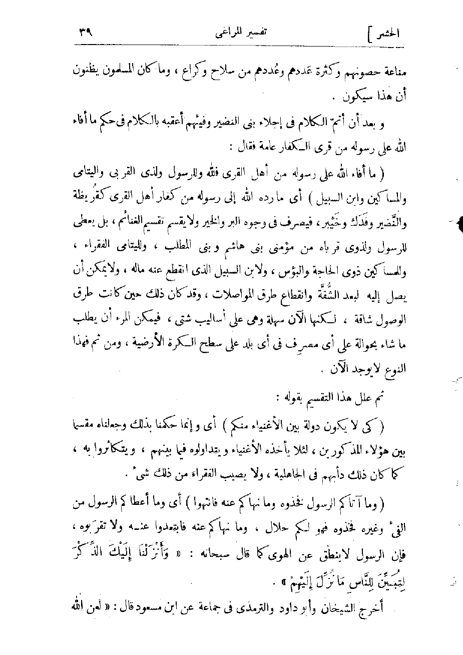 (ما أَفاءَ اللَّهُ عَلى رَسُولِهِ مِنْ أَهْلِ الْقُرى فَلِلَّهِ وَلِلرَّسُولِ وَلِذِي الْقُرْبى وَالْيَتامى وَالْمَساكِينِ وَابْنِ السَّبِيلِ) أي ما رده الله إلى رسوله من كفار أهل القرى كقريظة والنّضير وفدك وخيبر، فيصرف فى وجوه البر والخير ولا يقسم تقسيم الغنائم، بل يعطى للرسول ولذوى قرباه من مؤمنى بنى هاشم وبنى المطلب، ولليتامى الفقراء، وللمساكين ذوى الحاجة والبؤس، ولابن السبيل الذي انقطع عنه ماله، ولا يمكن أن يصل إليه لبعد الشّقّة وانقطاع طرق المواصلات، وقد كان ذلك حين كانت طرق الوصول شاقة، لكنها الآن سهلة وهى على أساليب شتى، فيمكن المرء أن يطلب ما شاء بحوالة على أي مصرف فى أي بلد على سطح الكرة الأرضية، ومن ثم فهذا النوع لا يوجد الآن.