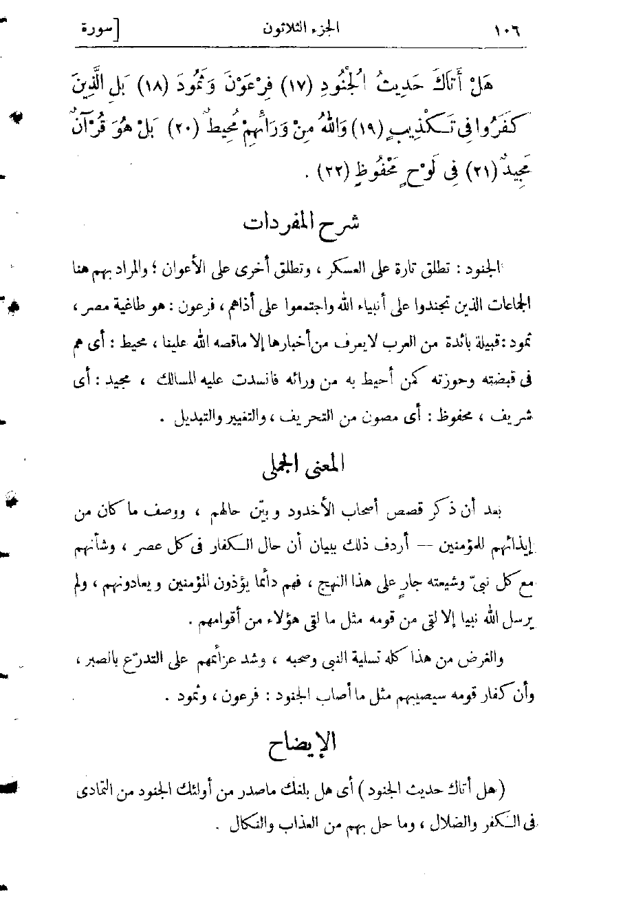 الجنود: تطلق تارة على العسكر، وتطلق أخرى على الأعوان والمراد بهم هنا الجماعات الذين تجندوا على أنبياء الله واجتمعوا على أذاهم، فرعون: هو طاغية مصر، ثمود: قبيلة بائدة من العرب لا يعرف من أخبارها إلا ما قصه الله علينا، محيط: أي هم فى قبضته وحوزته كمن أحيط به من ورائه فانسدت عليه المسالك، مجيد: أي شريف محفوظ: أي مصون من التحريف، والتغيير والتبديل.