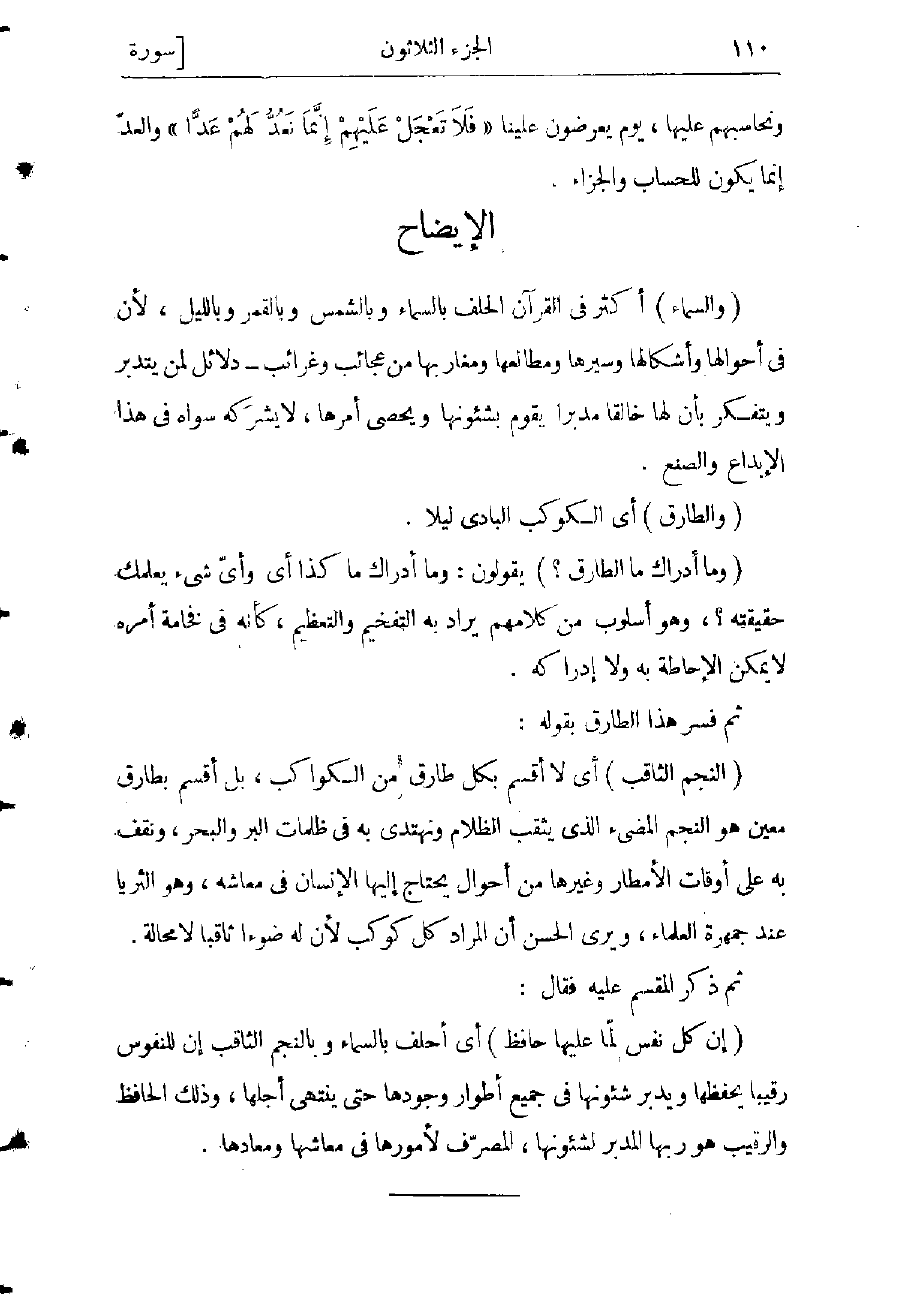 (النَّجْمُ الثَّاقِبُ) أي لا أقسم بكل طارق من الكواكب، بل أقسم بطارق معين هو النجم المضيء الذي يثقب الظلام ونهتدى به فى ظلمات البر والبحر، ونقف به على أوقات الأمطار وغيرها من أحوال يحتاج إليها الإنسان فى معاشه، وهو الثريا عند جمهرة العلماء، ويرى الحسن أن المراد كل كوكب لأن له ضوءا ثاقبا لا محالة.