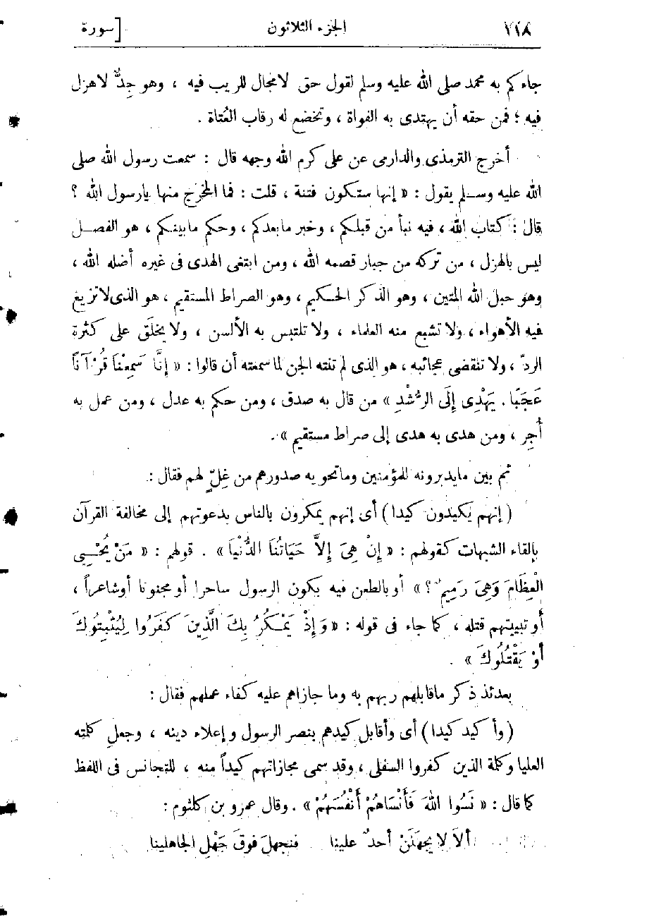 كتاب الله، فيه نبأ من قبلكم، وخبر ما بعدكم، وحكم ما بينكم، هو الفصل ليس بالهزل، من تركه من جبار قصمه الله، ومن ابتغى الهدى فى غيره أضله الله، وهو حبل الله المتين، وهو الذكر الحكيم، وهو الصراط المستقيم. هو الذي لا تزيغ فيه الأهواء، ولا تشبع منه العلماء، ولا تلتبس به الألسن، ولا يخلق على كثرة الردّ، ولا تنقضى عجائبه. هو الذي لم تنته الجن لما سمعته أن قالوا: «إِنَّا سَمِعْنا قُرْآناً عَجَباً يَهْدِي إِلَى الرُّشْدِ» من قال به صدق، ومن حكم به عدل، ومن عمل به أجر، ومن هدى به هدى إلى صراط مستقيم» .
