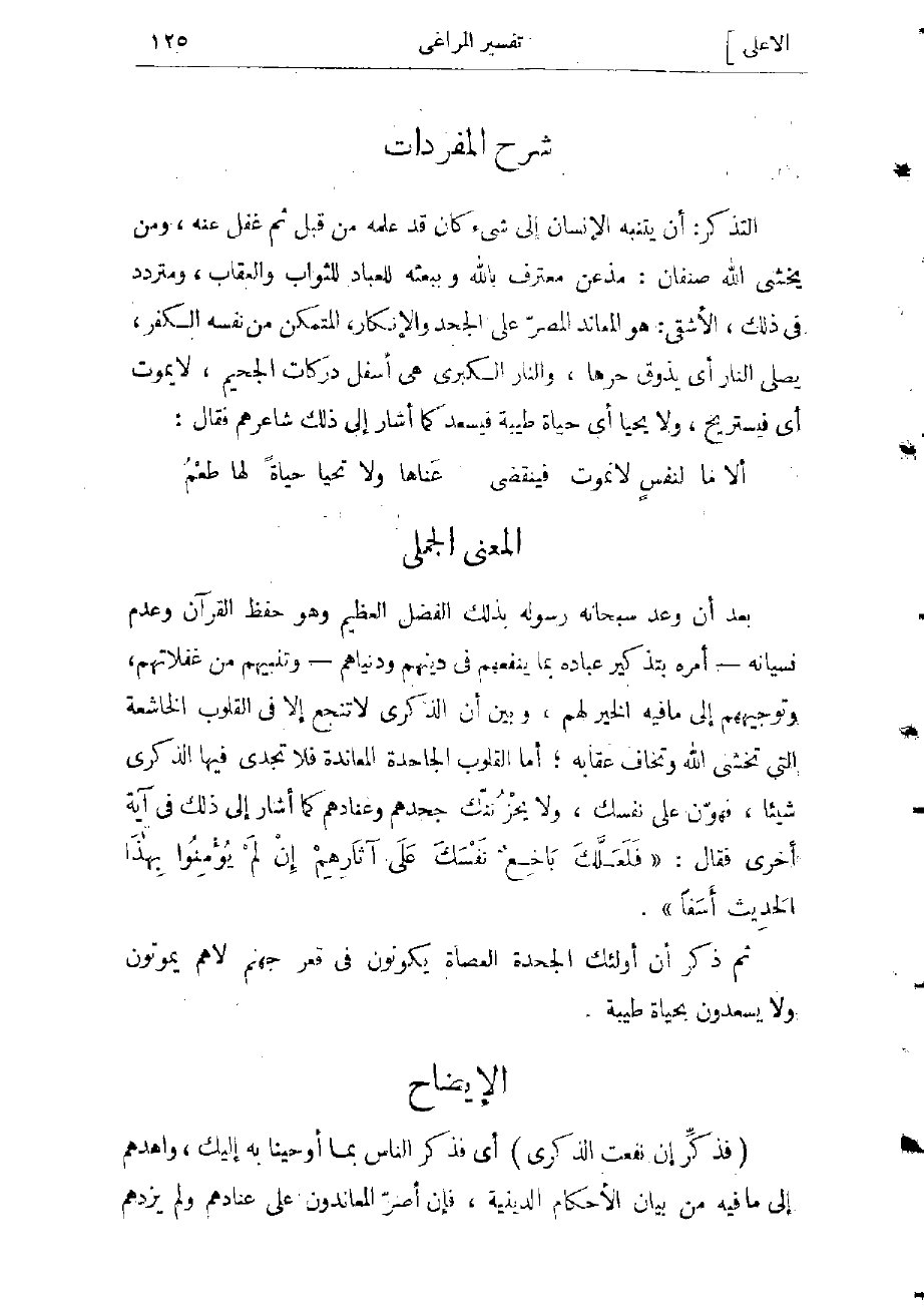 التذكر: أن يتنبه الإنسان إلى شىء كان قد علمه من قبل ثم غفل عنه، ومن يخشى الله صنفان: مذعن معترف بالله وببعثه للعباد للثواب والعقاب، ومتردد فى ذلك، الأشقى: هو المعاند المصرّ على الجحد والإنكار، المتمكن من نفسه الكفر، يصلى النار: أي يذوق حرها. والنار الكبرى هى أسفل دركات الجحيم، لا يموت: أي فيستريح ولا يحيا: أي حياة طيبة فيسعد كما أشار إلى ذلك شاعرهم فقال: